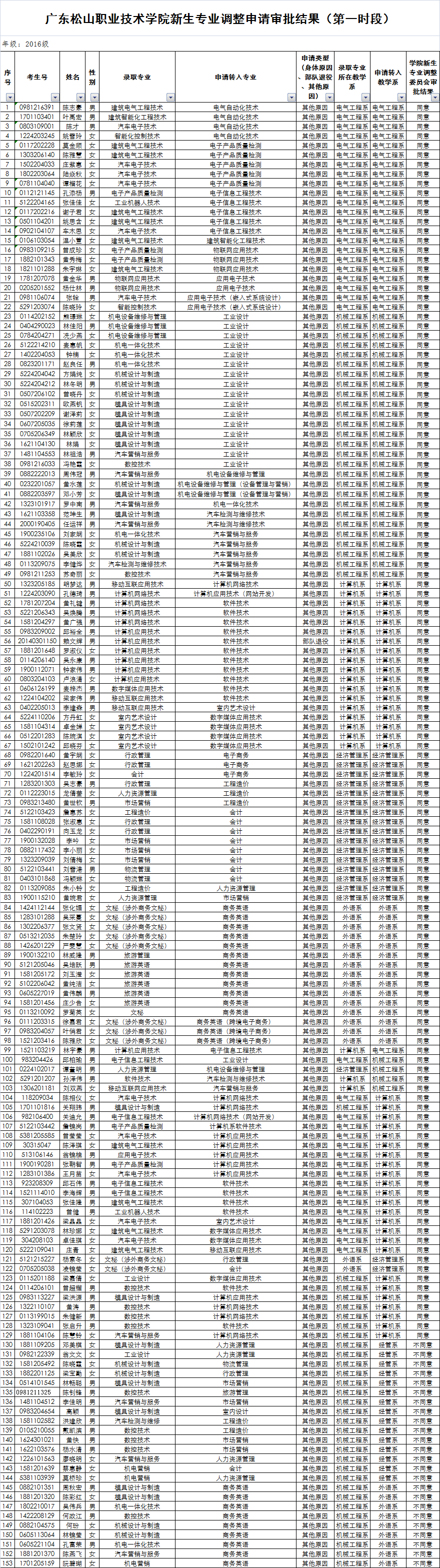 广东松山职业技术学院2016级新生专业调整【第一时段】审批结果的公示